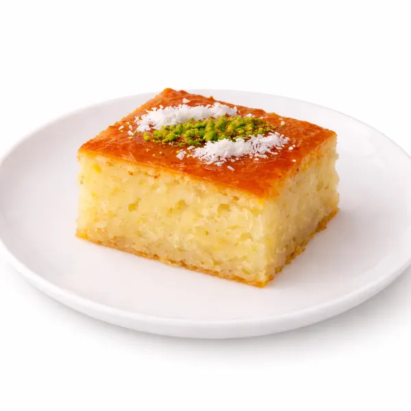 세몰리나 반죽으로 만든 케이크에 시럽을 적신 디저트
